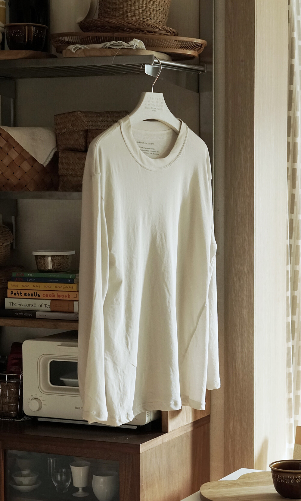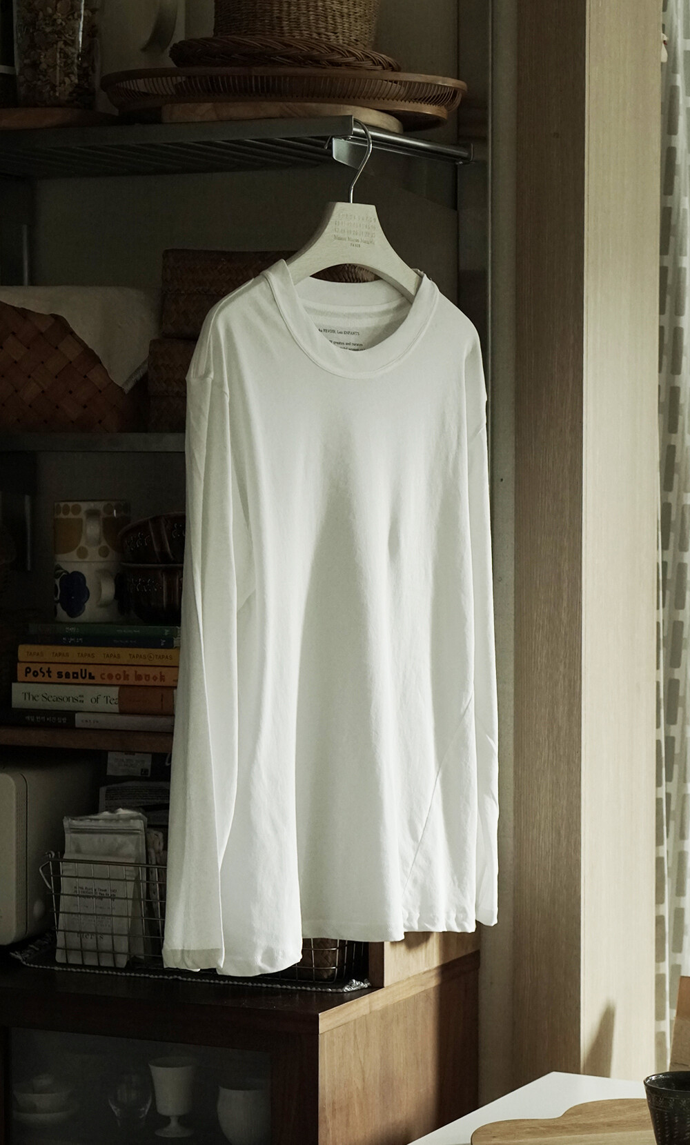 한여름 햇볕을 막아주는 시원한 소재이기도 하고 겨울엔 니트안에 레이어링 하기에도 좋아 4계절 내내 입기 좋은 가벼우며 찰랑거리는 소재의 코튼 티셔츠입니다.